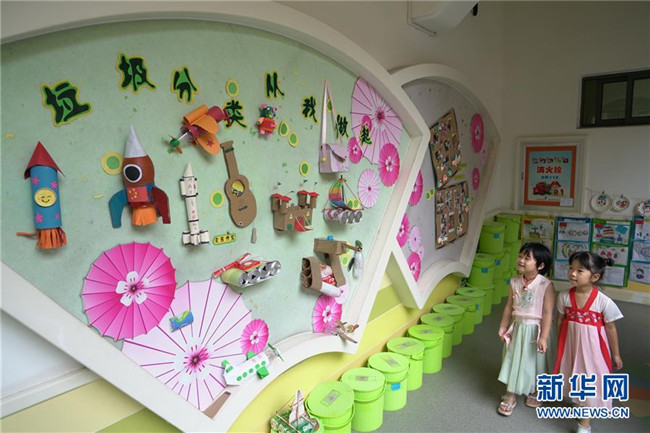 7月4日,德清縣乾元鎮(zhèn)第一幼兒園小朋友們在唱垃圾分類兒歌。新華社記者 郭緒雷 攝