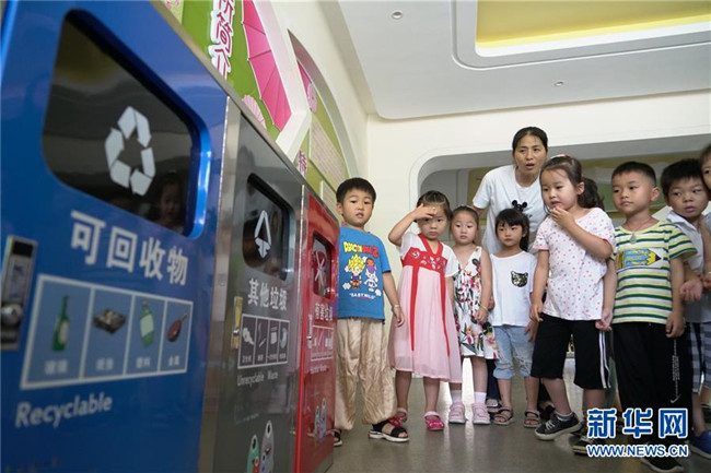 7月4日,小朋友在游戲中頭戴分類垃圾的圖案。新華社記者 張宏祥 攝