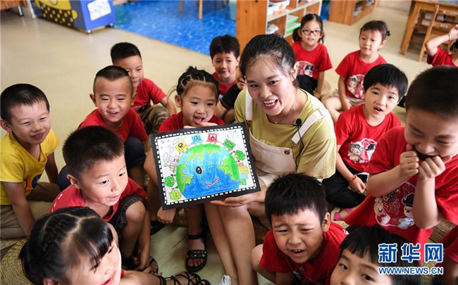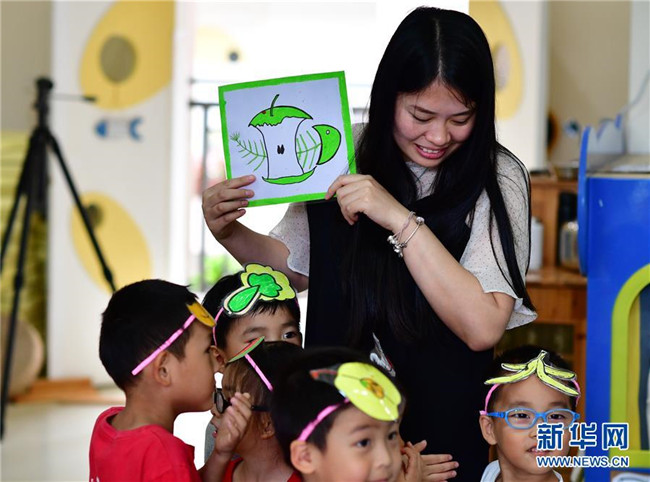 7月4日,德清縣乾元鎮(zhèn)第一幼兒園老師向孩子們講解環(huán)保知識。新華社記者 鄧華 攝