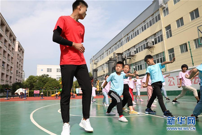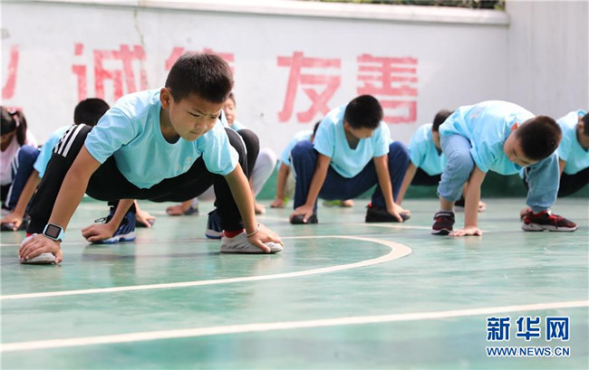 “小候鳥”們在武術(shù)課前做熱身運(yùn)動(dòng)(7月15日攝)。