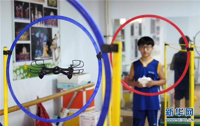 7月30日,學(xué)生在河北省涉縣青少年活動中心進(jìn)行航模飛行練習(xí)。