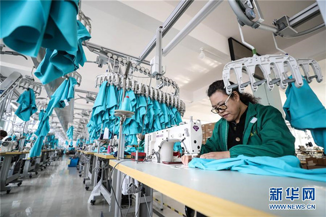 3月6日,工人在葫蘆島益豐(集團)運動服飾有限公司生產(chǎn)車間加工泳衣。新華社記者 潘昱龍 攝