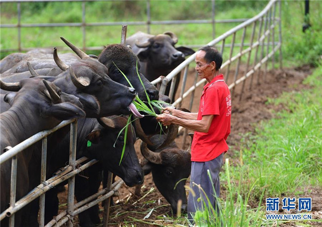 在廣西融安縣大良鎮(zhèn)古蘭村古蘭屯養(yǎng)牛基地,68歲的韋肇翠在喂牛(8月18日攝)。韋肇翠是養(yǎng)牛基地的飼養(yǎng)員,每個月有2800元的工資。 新華社記者 黃孝邦 攝