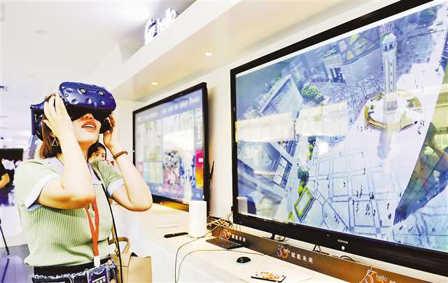 8月15日,在中國(guó)電信重慶公司,體驗(yàn)者頭戴VR設(shè)備,觀看解放碑的實(shí)時(shí)全景。在未來(lái),5GVR將會(huì)在智慧旅游、遠(yuǎn)程教育、遠(yuǎn)程會(huì)議等多領(lǐng)域應(yīng)用。(本組圖片均由記者張錦輝攝)