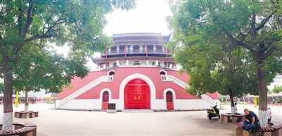玉皇閣通高22米,臺座正中辟有南北向的拱形門洞。西北側(cè)外部有石條臺階可登上臺座。臺座中央為高達14.1米的兩層重檐歇山頂大殿。整個建筑群重樓疊閣,飛檐相啄,布局巧妙,結(jié)構(gòu)嚴謹。