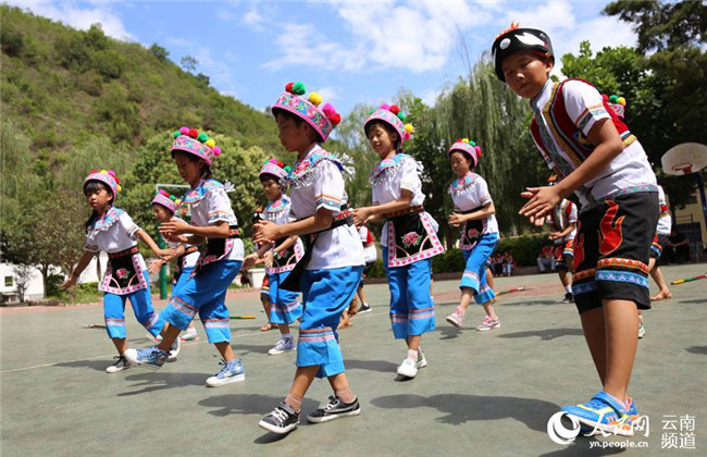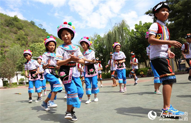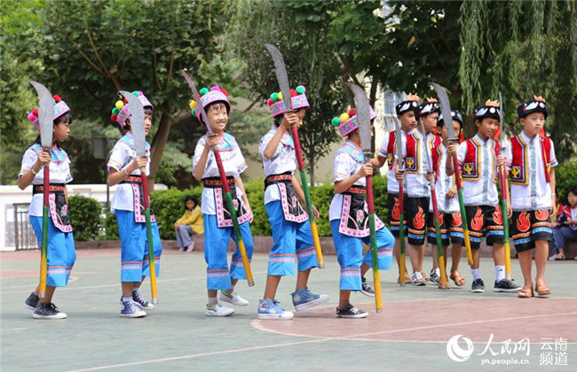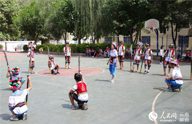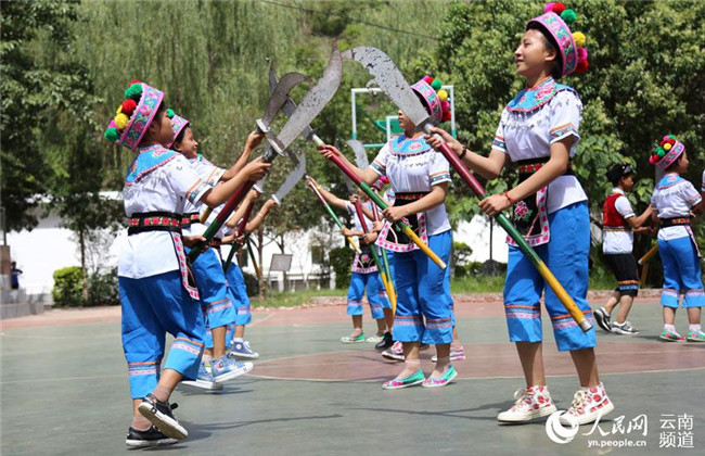 9月2日,云南省漾濞彝族自治縣雞街完小的學(xué)生在課間練習(xí)大刀舞。大刀舞是當(dāng)?shù)匾妥迦罕娫陂L期的生產(chǎn)生活實踐中逐漸積累演化形成的一種彝族文化,經(jīng)過代代藝人們的不斷傳承與完善,于2013年被列為省級非物質(zhì)文化遺產(chǎn)項目保護(hù)名錄。近年來,漾濞縣不斷加大非物質(zhì)文化遺產(chǎn)保護(hù)力度,組織非遺傳承人走進(jìn)校園,手把手教授孩子們學(xué)習(xí)大刀舞。(李發(fā)興)