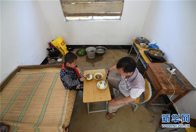 在廣西都安瑤族自治縣菁盛鄉(xiāng)義德小學(xué)弄豆教學(xué)點(diǎn),藍(lán)啟飛老師和學(xué)生藍(lán)孟源一起吃午餐(2015年4月15日攝)。當(dāng)時,藍(lán)啟飛是這所學(xué)校唯一的老師,藍(lán)孟源是這所學(xué)校唯一的學(xué)生。新華社記者 陸波岸 攝