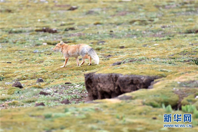 在青海省玉樹(shù)藏族自治州治多縣,一只藏狐雨后“漫步”在草場(chǎng)上(9月12日攝)。新華社記者孫瑞博攝