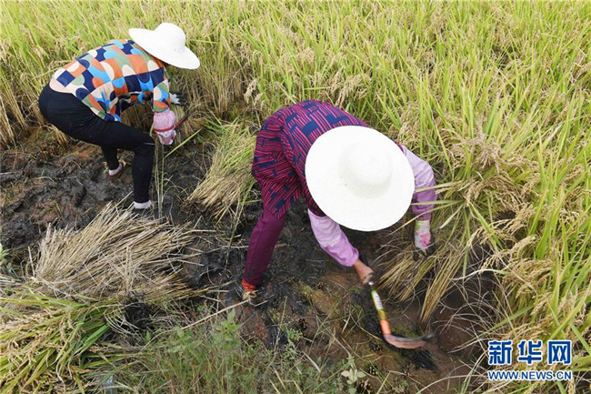 9月15日,云南尋甸回族彝族自治縣七星鎮(zhèn)魯古村的農婦在參加割稻谷比賽。