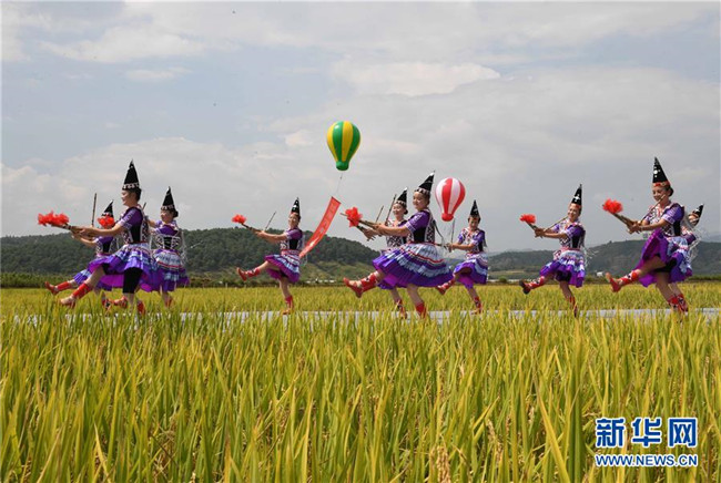9月15日,人們在田野里表演舞蹈《吹響蘆笙慶豐收》。