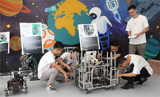 四川大學(xué)智能感知與先進(jìn)控制創(chuàng)新工坊中,團(tuán)隊帶頭人吳文強(qiáng)正在為同學(xué)們演示操作工程車機(jī)器人。 張勁松攝
