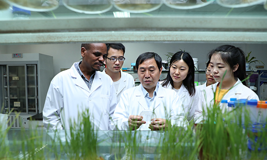 西北農(nóng)林科技大學(xué)旱區(qū)作物逆境生物學(xué)國家重點(diǎn)實驗室小麥-條銹菌互作室里,“小麥癌癥”攻克者康振生院士正指導(dǎo)學(xué)生觀察酵母菌落培養(yǎng)情況。張勁松攝