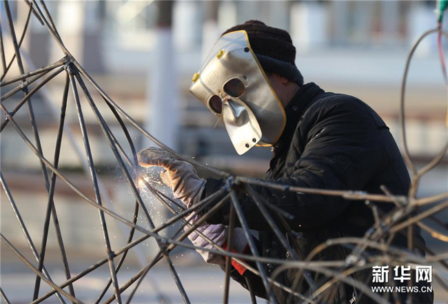 12月24日,工作人員在銀川花博園內(nèi)制作花燈。新華社記者 賈浩成 攝