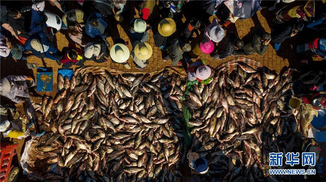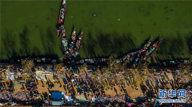 星云湖畔的老河咀魚市熱鬧非凡(12月25日無(wú)人機(jī)拍攝)。新華社記者 胡超 攝