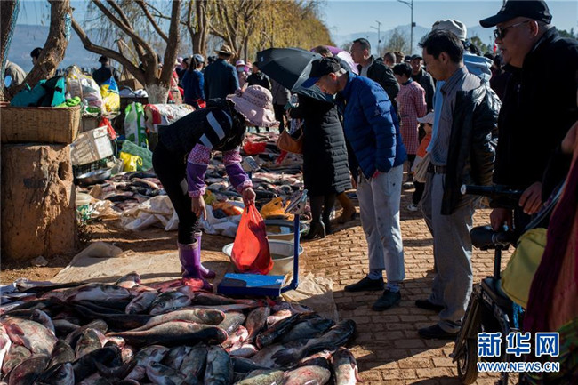 12月25日,人們?cè)谛窃坪系睦虾泳佐~市選購(gòu)剛捕撈的鮮魚。新華社記者 胡超 攝