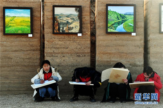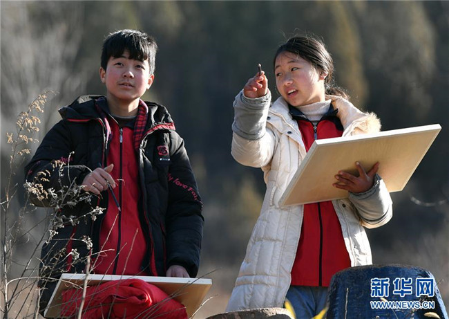 洛寧縣羅嶺鄉(xiāng)初級中學(xué)學(xué)生在洛寧縣前河村進行繪畫創(chuàng)作(12月29日攝)。新華社記者 李嘉南 攝
