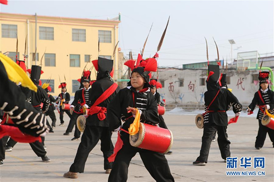 攻鼓子是發(fā)源于甘肅武威的一種民間鼓樂舞蹈,表演風(fēng)格渾厚豪邁、威武雄壯,具有強烈的地域特色。2008年,涼州攻鼓子被列為第二批國家級非物質(zhì)文化遺產(chǎn)。為更好地傳承這項非物質(zhì)文化遺產(chǎn),甘肅省武威市涼州區(qū)四壩鎮(zhèn)九年制學(xué)校組建攻鼓子藝術(shù)社團,開設(shè)攻鼓子校本課,定期由當(dāng)?shù)毓ス淖哟硇詡鞒腥藢W(xué)生進行指導(dǎo),推動“非遺”攻鼓子藝術(shù)教育普及。 新華社記者 耿馨寧 攝