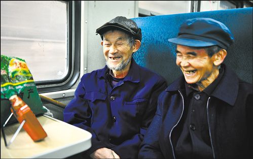 在7270次列車(chē)上,湖南省靖州苗族侗族自治縣的汪家(右)與楊永燦,在行駛的列車(chē)車(chē)廂里開(kāi)心地觀(guān)看“小電視”。