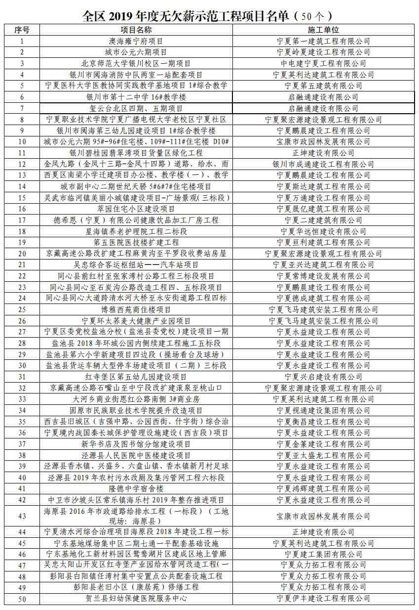 1月16日,記者從寧夏人力資源和社會保障廳獲悉,我區(qū)發(fā)布《關于2019年度全區(qū)無欠薪示范工程項目的通報》,對50個認真履行農民工工資支付各項政策的在建工程項目給予表揚及企業(yè)誠信考核加分。