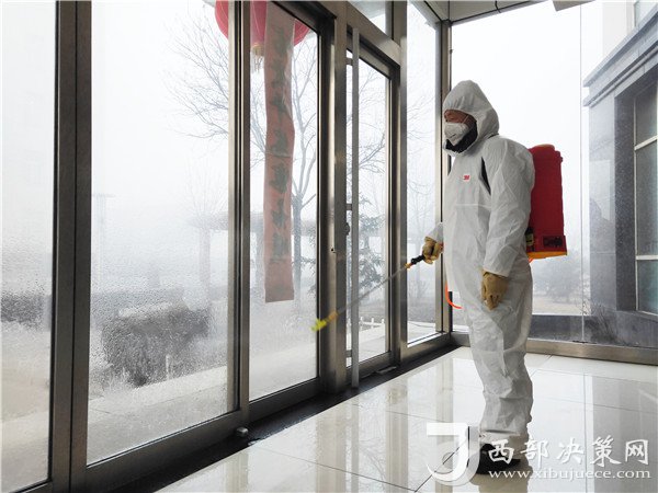 立春后的早晨,草地上仍然附著一層白茫茫的冰霜。陜北礦業(yè)檸條塔公司的公寓樓大廳里,武存照身穿白色防護服,手拎消毒箱,一邊默默地噴灑著刺鼻的84消毒水,一邊目不轉(zhuǎn)睛地盯著腳下,生怕漏掉一個角落。