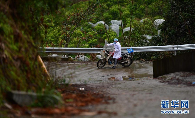 在廣西龍勝各族自治縣樂(lè)江鎮(zhèn)涼坪村,粟萬(wàn)龍的哥哥粟從軍騎車(chē)上路,準(zhǔn)備發(fā)放疫情防控宣傳材料(2月8日攝)。