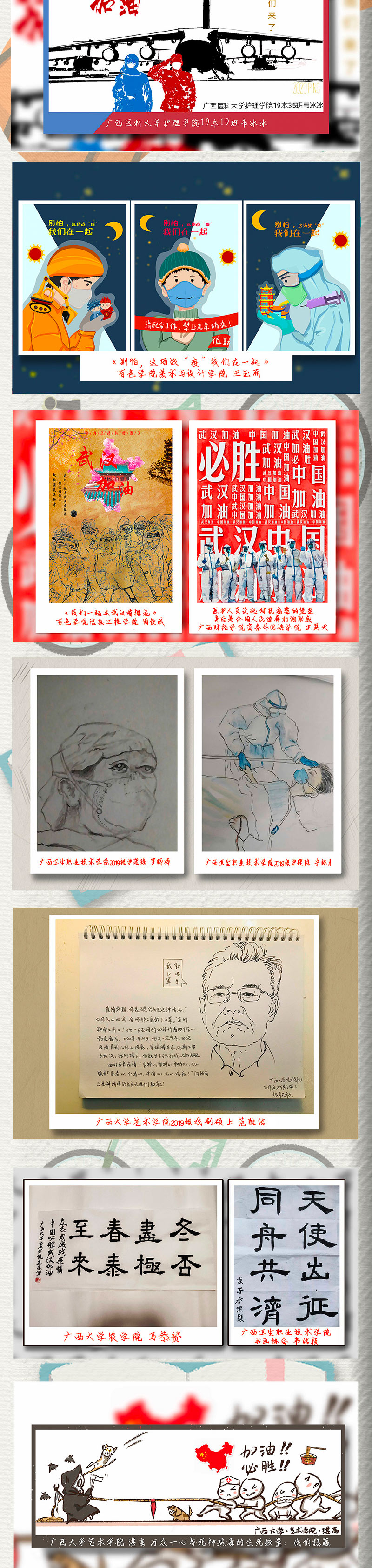 廣西各大高校的青年學子心系“疫”線,以抗擊疫情為主題創(chuàng)作了一批鼓舞人心的公益作品,向逆行英雄致敬,鼓勵人們積極樂觀面對疫情,以頑強意志、必勝信念打贏疫情阻擊戰(zhàn)。(彭遠賀、實習生溫嘉康)