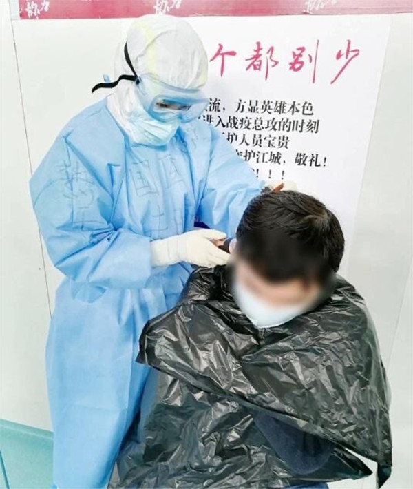 1艙有康復人員想理發(fā),手頭沒有工具,朱晴護士長得知后,聯系下個班次護士帶來推子,給大家理發(fā)。“看你動作很嫻熟啊,以前練過的吧”,“圍觀群眾”打趣道。“現學現賣,大家要求不要太高,有壓力??!”朱晴說。一直推到推子沒電,朱晴給6位康復人員簡單修剪了頭發(fā)。得知朱晴是西安醫(yī)療隊的護士,大家都親切的稱她“肉夾饃”!