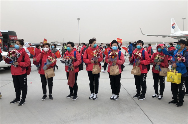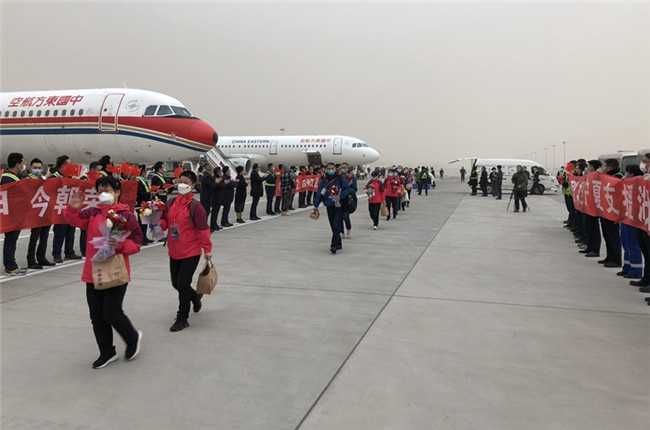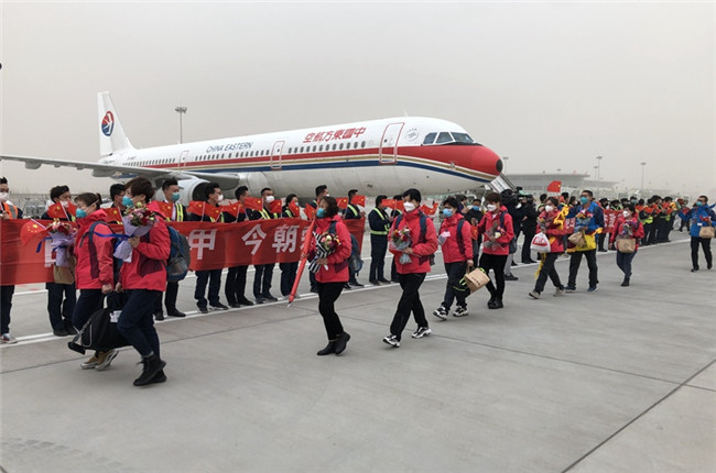 寧夏第五、第六批援湖北醫(yī)療隊(duì)員乘飛機(jī)抵達(dá)銀川。高嘉蔚 攝