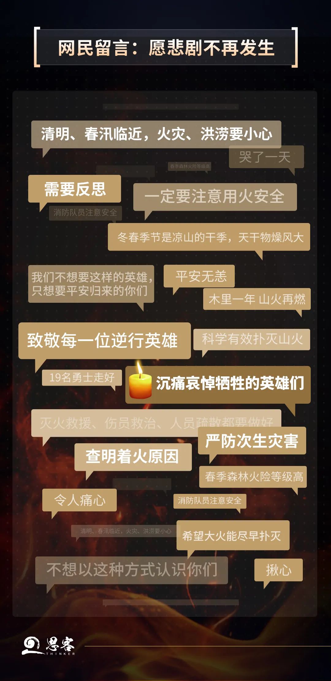 “火災(zāi)”“英雄”“反思”是網(wǎng)民留言中的高頻詞,“我們不想要這樣的英雄,只想要平安歸來的你們”成為網(wǎng)民共同心聲。逆火而行的英雄值得尊敬,但確保撲火人員安全更是前提。有網(wǎng)民說,一年前,四川木里的那場大火,造成31人不幸犧牲;一年后,又是一場大火,再次奪走19條鮮活的生命。春天天干物燥、山火肆虐蔓延、風(fēng)向突然變化,兩次火災(zāi)場景何其相似。我們需要認(rèn)真反思,加大對風(fēng)向突變的預(yù)判,利用更多科技手段滅火,避免火災(zāi)“風(fēng)”險悲劇重演。
