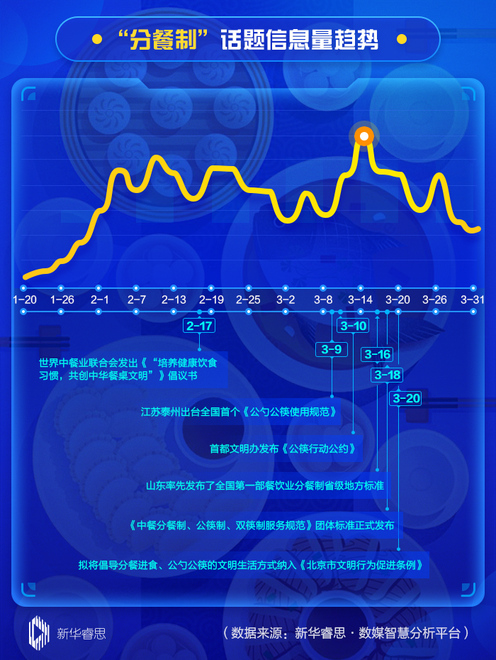 根據(jù)新華睿思·數(shù)媒智慧分析平臺數(shù)據(jù)顯示,在最近兩個月來,關(guān)于分餐制話題的關(guān)注度不斷上升,全國范圍內(nèi)信息量累計達到1039539條。其中,從話題趨勢演變圖看,3月14日達到輿論熱度的首個峰值(30183條),這與北京、江蘇泰州等地發(fā)布出臺關(guān)于公筷使用的文件直接相關(guān)。