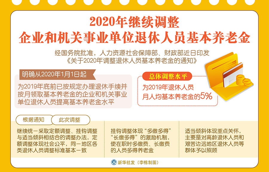 經(jīng)國務院批準,人力資源社會保障部、財政部近日印發(fā)《關于2020年調(diào)整退休人員基本養(yǎng)老金的通知》,明確從2020年1月1日起,為2019年底前已按規(guī)定辦理退休手續(xù)并按月領取基本養(yǎng)老金的企業(yè)和機關事業(yè)單位退休人員提高基本養(yǎng)老金水平,總體調(diào)整水平為2019年退休人員月人均基本養(yǎng)老金的5%。