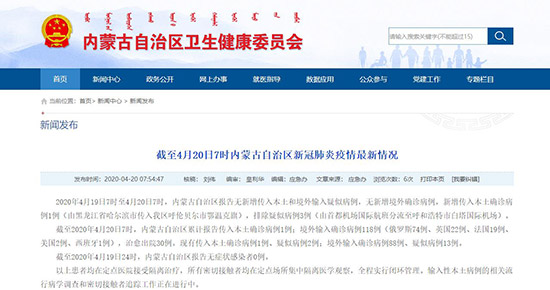 截至2020年4月19日24時,內蒙古自治區(qū)報告無癥狀感染者0例。