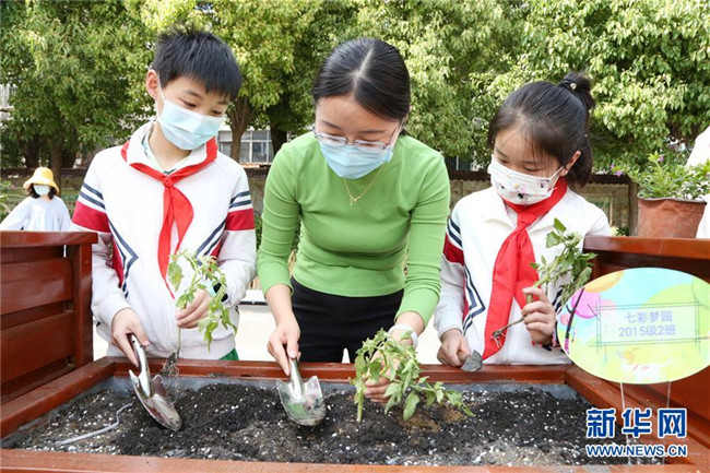 4月29日,在安徽省合肥市臨泉路第二小學(xué),學(xué)生在班級(jí)“責(zé)任田”里栽種農(nóng)作物幼苗。新華社發(fā)(傅軍 攝)
