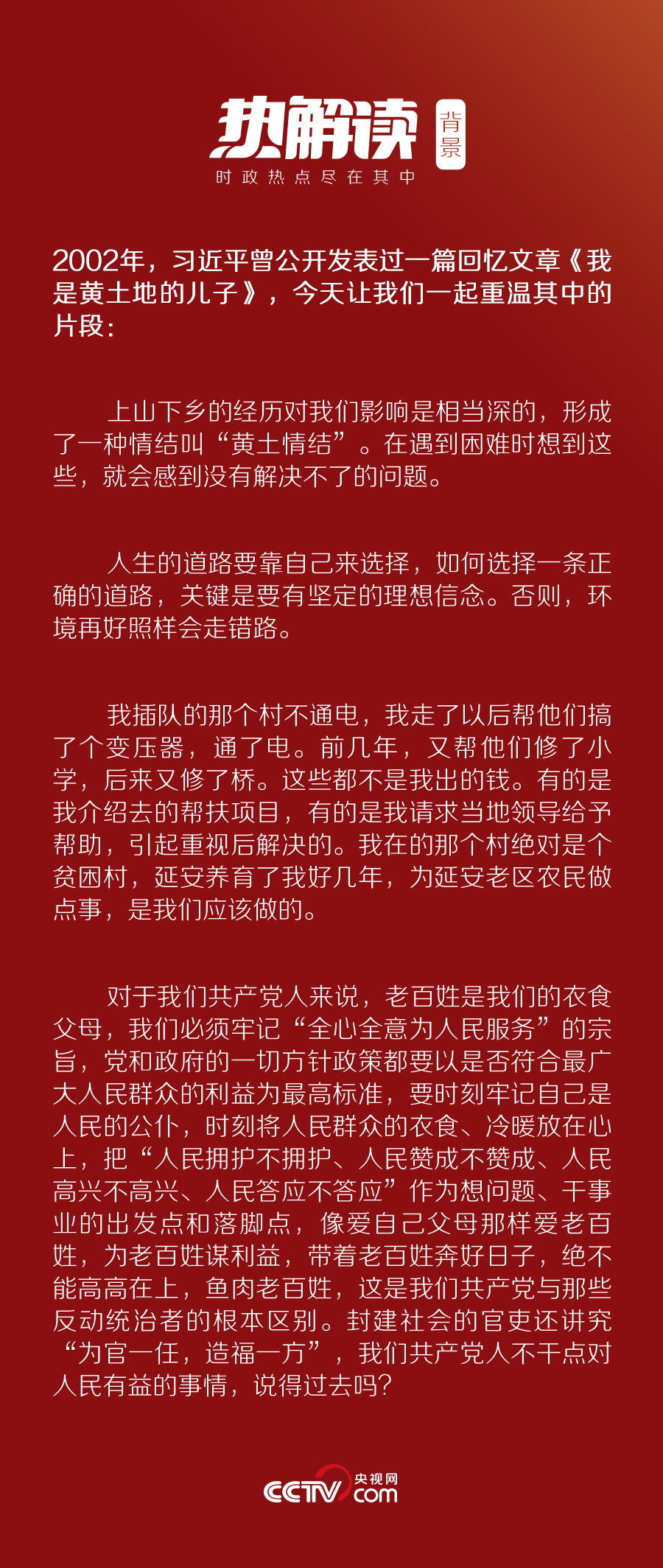 早在十幾年前,習(xí)近平就曾在《我是黃土地的兒子》一文中提到過(guò)“情結(jié)”二字。他說(shuō),上山下鄉(xiāng)的經(jīng)歷對(duì)我們影響是相當(dāng)深的,形成了一種情結(jié)叫“黃土情結(jié)”。