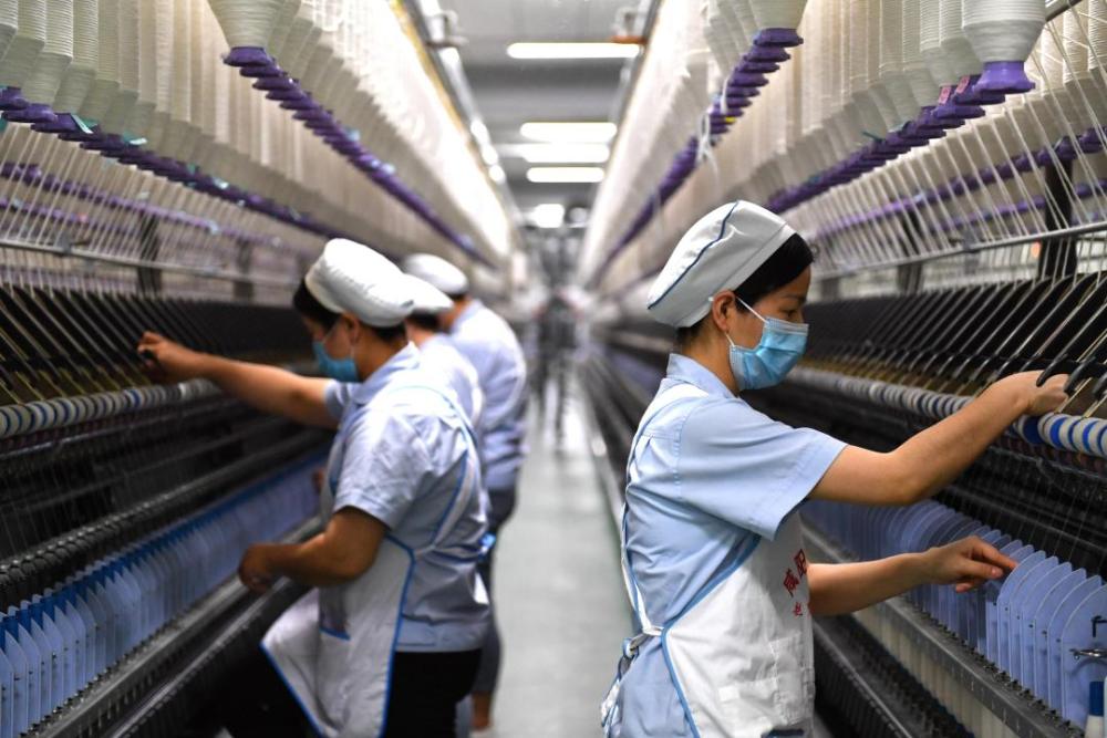 在抗擊新冠肺炎疫情過程中,陜西省咸陽紡織集團(tuán)有限公司一分廠紡織工人堅守在復(fù)工復(fù)產(chǎn)一線,搶抓工時完成生產(chǎn)任務(wù)。(新華社記者張博文 攝)