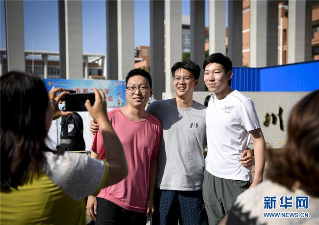 7月8日,在重慶市徐悲鴻中學(xué)考點(diǎn),考生在考試結(jié)束后在校門口合影。 當(dāng)日,全國(guó)部分地區(qū)2020年高考結(jié)束。 新華社記者 唐奕 攝