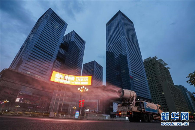 7月20日,烏魯木齊市天山區(qū)城管局清運隊的工作車輛在市區(qū)光明路附近進(jìn)行消殺作業(yè)。新華社記者 趙戈 攝