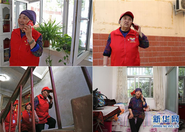 這是一張拼版照片。左上圖為:王蘭花在蘭花志愿服務站組織活動間隙接聽電話(6月23日攝);左下圖為:王蘭花在探望裕西社區(qū)老黨員的途中接聽電話(6月23日攝);右上圖為:王蘭花在裕西社區(qū)巡邏間隙接聽電話(6月23日攝);右下圖為:王蘭花下班回到家后接聽電話(6月23日攝)。由于平日經(jīng)常收到群眾求助,接聽電話成為王蘭花工作和生活中的常態(tài)。新華社記者 賈浩成 攝