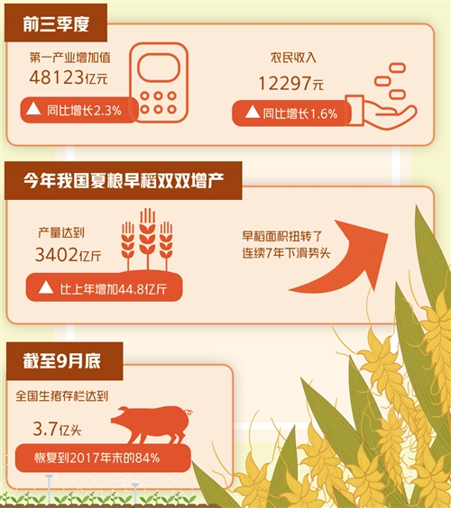 數(shù)據(jù)顯示,前三季度我國第一產業(yè)增加值48123億元,同比增長2.3%;農民收入12297元,同比增長1.6%。農業(yè)生產形勢較好,成為國民經濟運行的突出亮點,“三農”壓艙石作用更加凸顯,為穩(wěn)定經濟社會發(fā)展大局提供了有力支撐。
