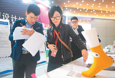 日前,中國設(shè)計(jì)紅星獎(jiǎng)(諸暨)產(chǎn)品設(shè)計(jì)大賽在浙江省諸暨市開啟現(xiàn)場實(shí)物評(píng)審。為推動(dòng)襪業(yè)“設(shè)計(jì)+科技”的創(chuàng)新,今年的主題聚焦襪業(yè),共有387件擁有外觀設(shè)計(jì)專利的作品入圍實(shí)物終評(píng)。江 漢攝(新華社發(fā))
