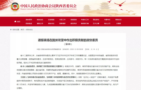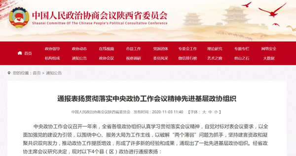 中央政協(xié)工作會議召開一年多來,陜西全省各級政協(xié)組織認(rèn)真貫徹落實會議精神,堅持建言資政和凝聚共識雙向發(fā)力,推動政協(xié)工作提質(zhì)增效,形成了許多新的經(jīng)驗和成果,涌現(xiàn)出了一批先進基層政協(xié)組織。2020年11月2日,省政協(xié)十二屆四十七次主席會議決定通報表揚貫徹落實中央政協(xié)工作會議精神先進基層政協(xié)組織,金臺區(qū)政協(xié)、富平縣政協(xié)、富縣政協(xié)和柞水縣政協(xié)4家縣(區(qū))政協(xié)組織榜上有名。