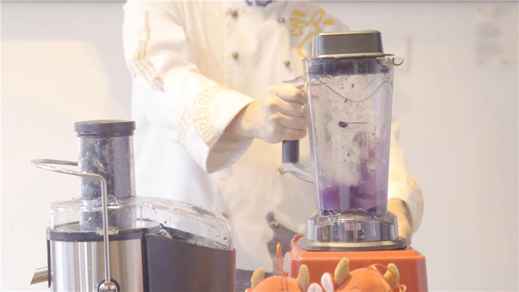 把切塊的蔬果依次放入榨汁機(jī)榨汁。