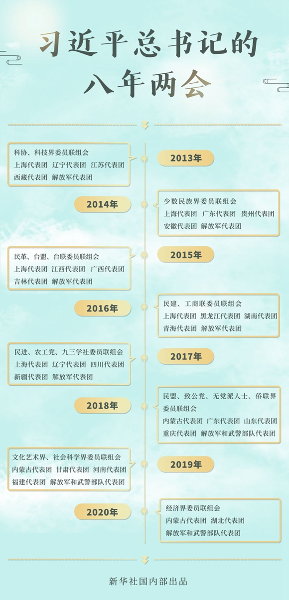 2013-2020,八年的全國(guó)兩會(huì)上,總書記46次到團(tuán)組參加審議討論。交流之中,語(yǔ)重心長(zhǎng);言談之間,發(fā)人深思。
