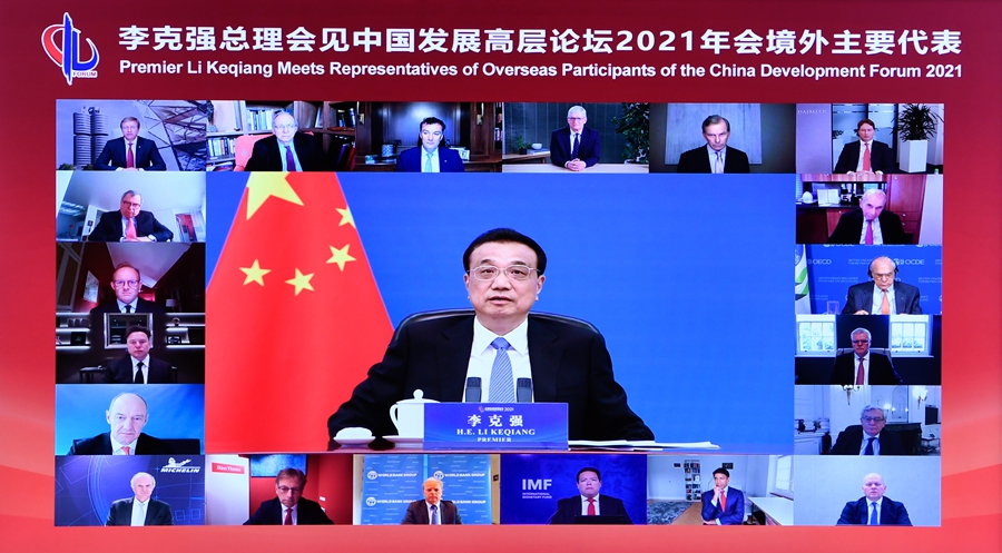 國(guó)務(wù)院總理李克強(qiáng)3月22日晚在人民大會(huì)堂以視頻方式會(huì)見(jiàn)出席中國(guó)發(fā)展高層論壇2021年年會(huì)的境外代表。來(lái)自世界五百?gòu)?qiáng)企業(yè)的負(fù)責(zé)人、國(guó)際知名學(xué)術(shù)研究機(jī)構(gòu)的專家學(xué)者和主要國(guó)際組織代表等參加。