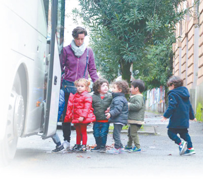 意大利羅馬一家幼兒園的小朋友們在老師的組織下登上校車。 本報(bào)記者 韓 碩攝