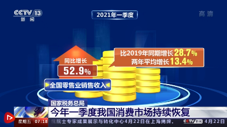 央視網(wǎng)消息:國家稅務(wù)總局數(shù)據(jù)顯示,一季度,我國零售業(yè)銷售收入兩年平均增長超10%,消費市場持續(xù)恢復。
