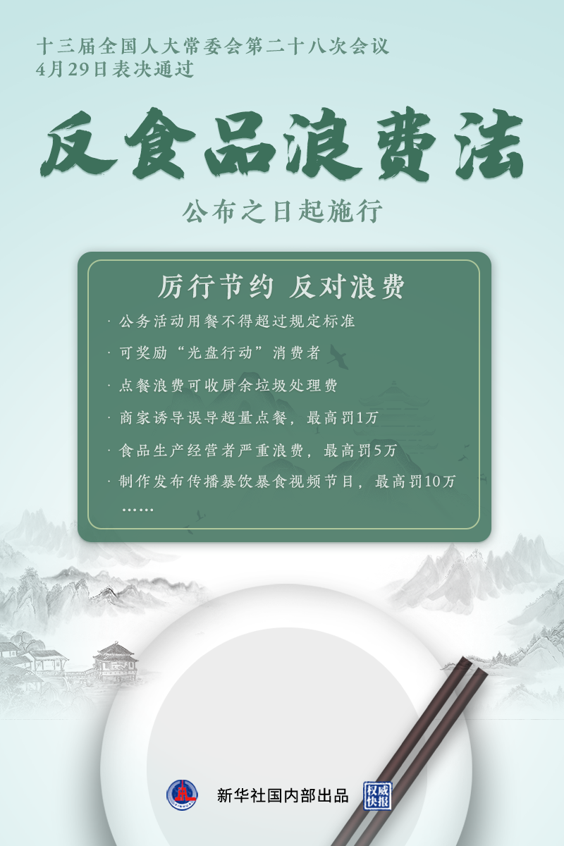 4月29日,十三屆全國(guó)人大常委會(huì)第二十八次會(huì)議表決通過(guò)反食品浪費(fèi)法,防止食品浪費(fèi)從此有法可依。