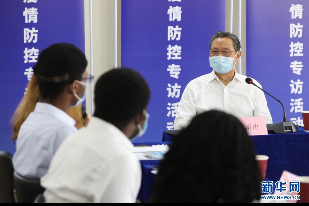 2020年4月15日,廣州市人民政府新聞辦公室在廣州醫(yī)科大學(xué)舉辦廣州市第78場(chǎng)疫情防控新聞采訪活動(dòng),鐘南山與在穗工作學(xué)習(xí)的外籍人士代表進(jìn)行座談交流。新華社記者 李嘉樂(lè) 攝