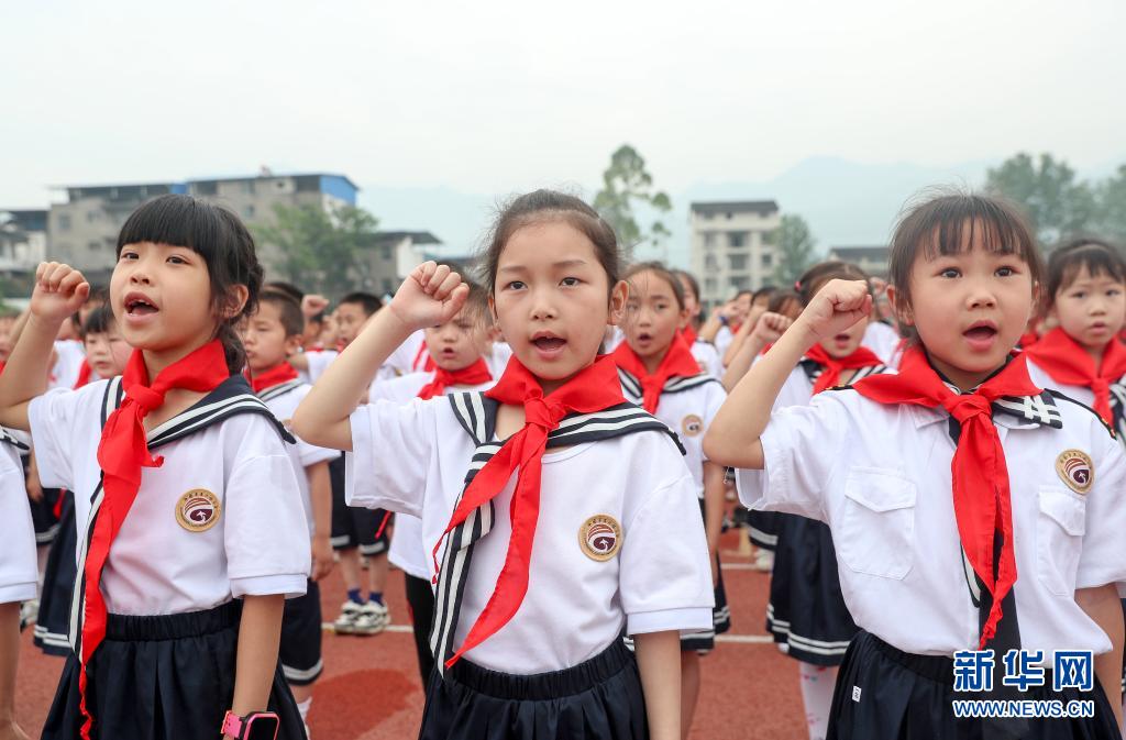 5月31日,四川省華鎣市高興鎮(zhèn)小學(xué)少先隊(duì)新隊(duì)員在入隊(duì)儀式上宣誓。新華社發(fā)(邱海鷹 攝)
