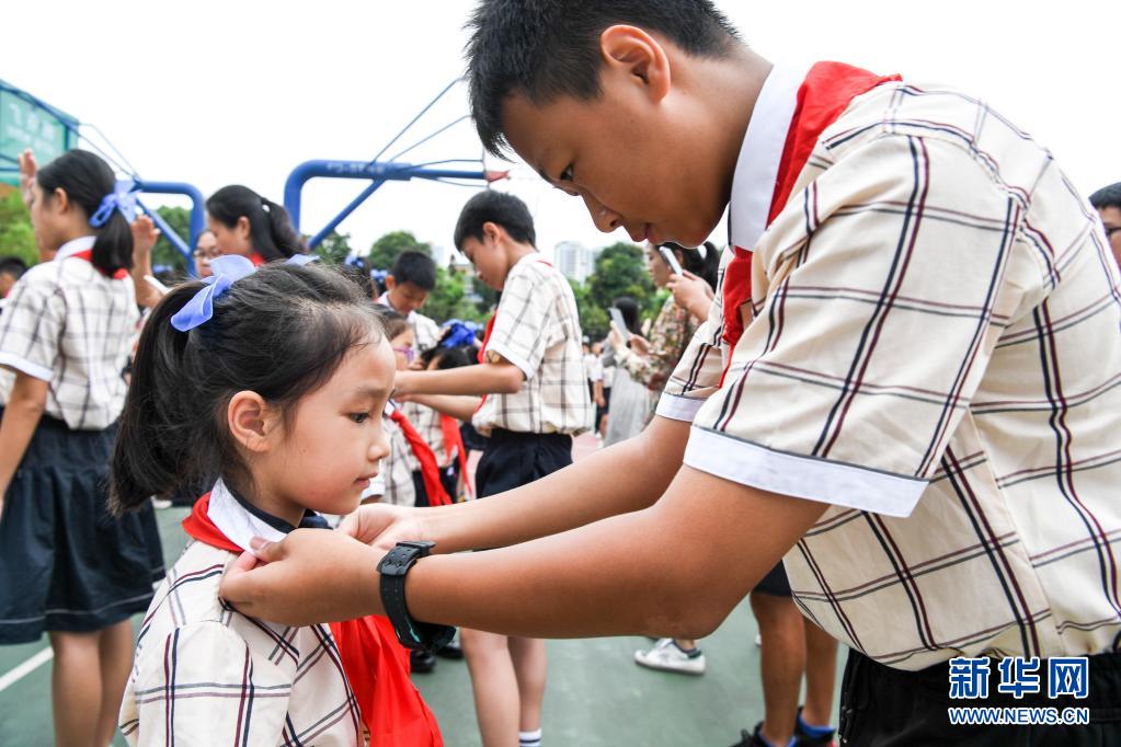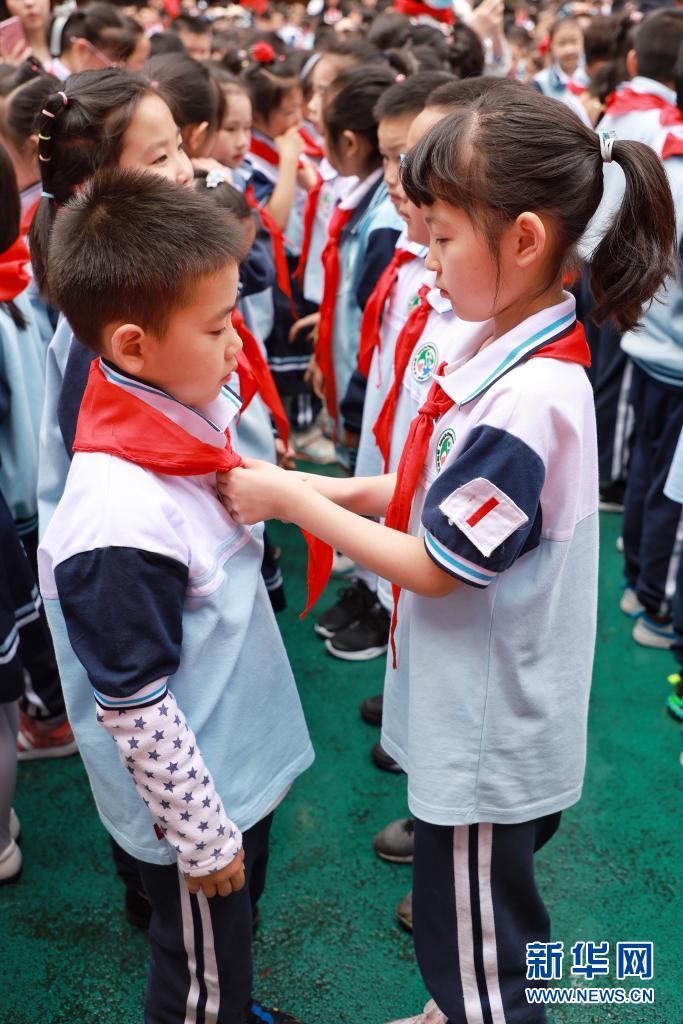 5月31日,高年級的少先隊(duì)員在入隊(duì)儀式上為新入隊(duì)的同學(xué)系紅領(lǐng)巾。新華社記者 劉續(xù) 攝